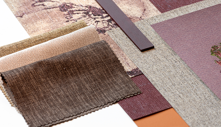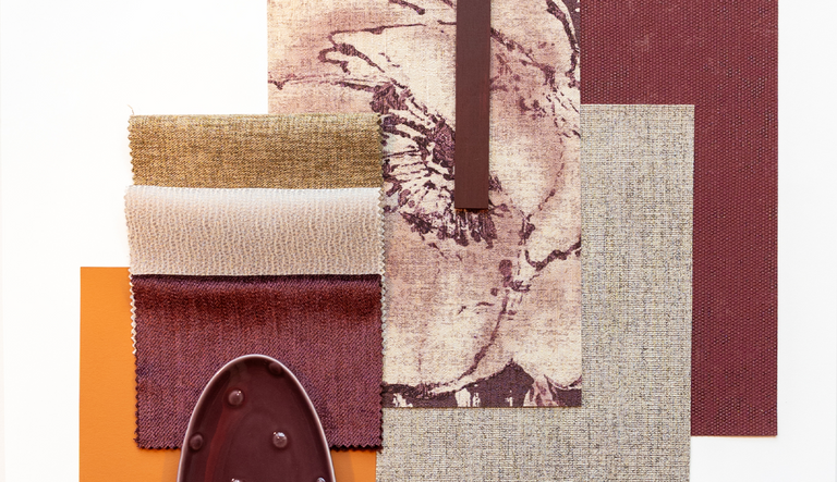 Voor het raam adviseren we rijke gordijnstoffen: een volle weving in bordeaux voor diepte, gecombineerd met een lichtbruine/terra stof voor een warm-aardse tegenkleur. Of ga voor een oudroze inbetween gordijn om de romantische uitstraling van het behang Emerald 333415 te versterken.