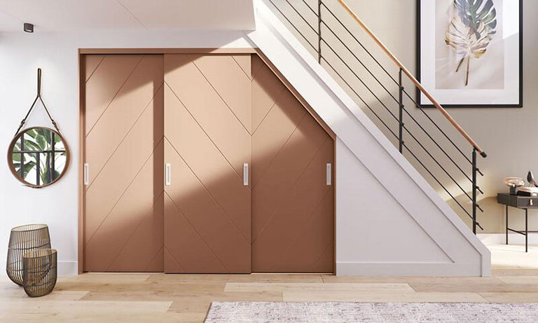 Stap 7: meet met de zweihaak de juiste hoek voor de deuren en eventueel het vaste paneel van je trapkast. Trek de hoek over op het materiaal waarvan je de deur gaat maken en zaag de platen op maat of laat dit ons doen.
