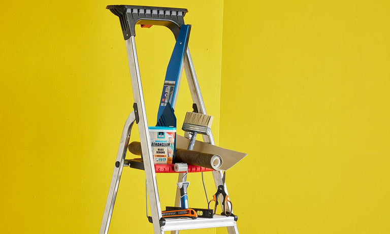 Dit heb je nodig: rechte lat, duimstok, lange waterpas, potlood, behanglijm, behangroller, behangspatel, droge doek, vochtige doek, behangliniaal, afbreekmes en een behangschaar.